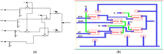 The proposed 4 × 1 n-pass time division analog multiplexer design is depicted in Figure 3a using 45 nm CMOS technology. The 4 × 1 time division multiplexing (TDM) technique sends four distinct signals across a signal line using synchronized switches, which are transmitted sequentially in time. The multiplexer has been designed using low-power pass transistor logic (LPPTL), which requires only six transistors. The source/drain terminals of the n-pass transistors are connected to the inputs from electrodes with dimensions of L = 45 nm and W = 120 nm. Figure 3b illustrates the physical layout structure of a 4 × 1 n-pass MUX.