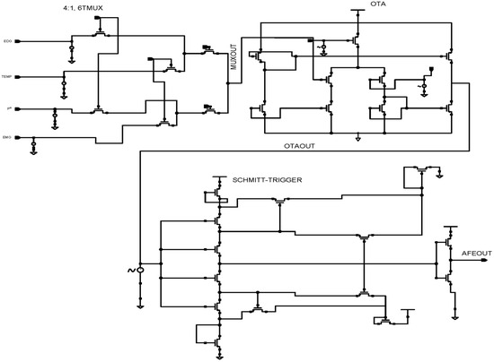The following discussion will be focused on previous research that was published regarding each block and how their designs were put into implementation. A 0.18 µW CMOS fabrication method was used to create an AFE—CMOS circuit proposed by Zhu et al. While occupying 1 mm2, it only consumes 1.3 µW at 0.5 V [19]. Kong [20] has proposed a pseudo-differential capacitive MEMS accelerometer AFE design using 0.18 µm CMOS technology. Output modulation moves the low-frequency capacitance sensor output from 2 to 12 kHz to the high frequency 800 kHz range. In turn, it receives a CMRR of 95 dB and a 0.5–250 Hz span. The main part of our proposed WMD is an MUX-based AFE design with a 4 × 1 6 T n-pass multiplexer, a single-ended differential feedback OTA, and a low-power CMOS Schmitt trigger. Simulations undertaken with the Cadence Virtuoso tool show that the proposed AFE design, which uses 45 nm technology with a span of 100 kHz, uses less power and takes up less space in an integrated IC design.