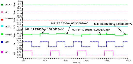 In our proposed design, the output produced the least possible delay due to time division multiplexing techniques. The combination of inputs at the selection lines S0 and S1 determines the multiplexer’s output. The sensors’ sampled input values were 10 mV for EMG, 63.3 mV for pH, 100 mV for temperature, and 5.0 mV for ECG. The 4 × 1 MUX transient response output wave form is seen in Figure 7. Marker M1 indicates an 11.21083 ns output as 100.0002 mV, which is the temperature output when the pulse input S0 = 1, S1 = 0 with the least error 0.0002, indicating our proposed circuit runs more accurately.