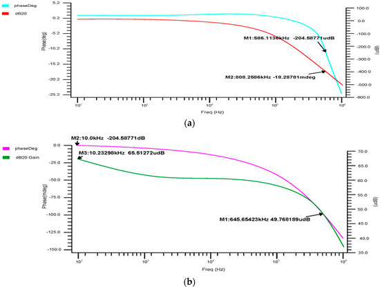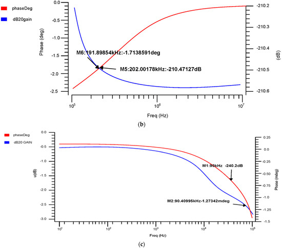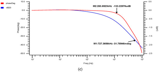 The 180 nm 4 × 1 multiplexer’s phase-versus-gain output curve, shown in Figure 8a, indicates that the cutoff frequency is 586.1 kHz and the gain is −204.9 mdB, with a 3 dB phase margin of −16.68°. Figure 8b shows the 90 nm 4 × 1 multiplexer output curve, with a cutoff frequency of 203.652 kHz, a gain of −133.92 mdB, and a 3 dB phase margin of −31.76°. The 45 nm 4 × 1 multiplexer’s phase-versus-gain output curve is shown in Figure 8c. The above results show that the gain margin (GM) increases the stability of the 4 × 1, which is suitable for accurately gathering and analyzing the bio-signal from the sensors.