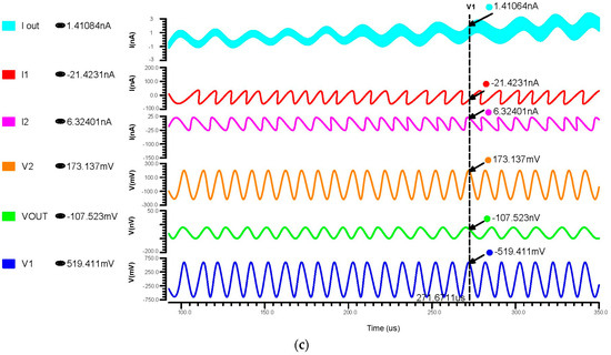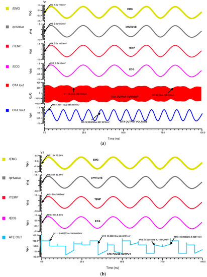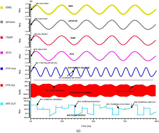 Figure 12a indicates that the inputs from the sensors range in voltage from 5 mV to 100 mV, which differential OTA amplifies to about 680 mV, and that their currents are then in the range of about 300 µA, Figure 12b shows that the input of the Schmitt trigger analog current signal is converted to a voltage pulse signal. The Schmitt trigger output ranges from 5 mV to 110 mV, depending on the inputs at different times. Using a differential OTA circuit, an AFE device is able to read analog data from sensors for the ECG, EMG, pH value, and temperature before converting them to current. A Schmitt trigger circuit then changes the current input to pulses by time variation. This is illustrated in Figure 12c.