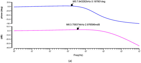 The phase and transient reaction are also important components of an amplifier, as the AC frequency response is used to determine the gain and bandwidth. The gain-versus-phase response was analyzed and the gain value was −59.07 dB at 43.19 kHz for 180 nm, 2.97 mdB at 3.75 kHz for 90 nm, and −1.23 dB at 90.40 kHz for 45 nm, as shown in Figure 10a–c.