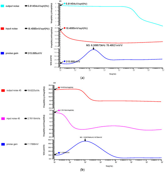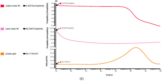 Each component’s noise contribution is estimated at the output node over the chosen frequency range. The input referred noise has been calculated as 2.05 µmVrms for 180 nm, 0.093 µmVrms for 90 nm, and 14.76 µmVrms for 45 nm, as shown in Figure 11. From these results, the 45 nm technology offered a low noise that brings a noise-free signal amplification for biological applications.