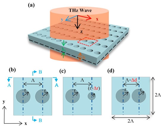 An all-silicon metasurface, consisting of an array of two air-holes, that we designed is shown in Figure 1a. The thickness of the metasurface is h = 200 μm, and the depth of air-holes is h1 = 150 μm. The periods of the unit cell in the x and y directions are Λx = 2Λ = 300 μm and Λy = 300 μm, respectively. Firstly, a symmetric metasurface is defined as follows: the distance between the centers of two adjacent air-holes in the x direction is Λ = 150 μm, and the radii of the two air-holes are equal, as shown in Figure 1b. Then, two parameters, Δr and Δd, are introduced to define asymmetric metasurfaces. Δr represents the difference between the radii of the two air-holes in the unit cell, as shown in Figure 1c. On the other hand, Δd represents the displacement of the two air-holes along the x direction, as depicted in Figure 1d.