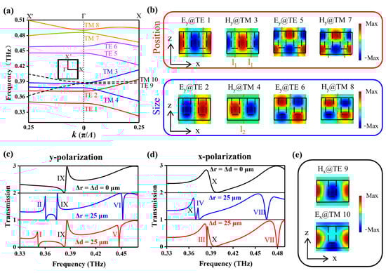 The above results can be confirmed by the calculated transmissions of the metasurface at different Δr and Δd under x- or y-polarized THz incidence, as shown in Figure 2c,d, where resonances I–VIII correspond to the eight GMRs. For the symmetric metasurface (Δr = Δd = 0 μm), the eight GMRs (with an infinite Q-factor) do not appear within the frequency range of 0.33–0.49 THz. However, there are two resonances, IX and X, located at 0.384 THz and 0.386 THz, excited under y- and x-polarized THz incidence, respectively. Additionally, the corresponding two eigenmodes, TE 9 and TM 10, can be found in Figure 2a,e. These two eigenmodes with a low Q-factor at Γ-point are exactly the same as those calculated from the metasurface with a single air-hole array, and their frequencies are highly sensitive to the period Λy. Therefore, we can conclude that TE 9 and TM 10 are TE1 and TM1 GMRs, respectively, excited by the (0,1) Rayleigh diffraction of a metagrating in the y direction.