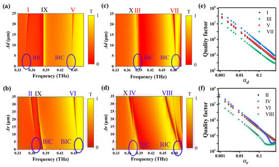 For the asymmetric metasurfaces with Δr = 25 μm or Δd = 25 μm, the eight GMRs that we considered are observed in Figure 2c,d. For example, at the y-polarized THz incidence, two GMRs, I and V, located at 0.352 THz and 0.448 THz, respectively, are excited in the metasurface when Δd = 25 μm. Resonances II and VI, located at 0.360 THz and 0.452 THz, respectively, are observed in the metasurface when Δr = 25 μm. Similarly, at the x-polarized terahertz incidence, two GMRs, III and VII, located at 0.385 THz and 0.480 THz, respectively, are excited for the metasurface when Δd = 25 μm. Resonances IV and VIII, located at 0.363 THz and 0.457 THz, respectively, are observed for the metasurface when Δr = 25 μm. Furthermore, we calculated the transmissions of the metasurface under y- and x-polarized THz incidence when Δd varies from 0 to 25 μm or Δr varies from 0 to 35 μm, as shown in Figure 3a–d. With the decrease in asymmetric parameters Δd or Δr, the bandwidth of GMRs I–VIII gradually decreases and becomes zero when Δr = 0 μm or Δd = 0 μm. The position of the ideal BIC is shown in blue circles in Figure 3a–d. Meanwhile, the relationships between the Q-factor of resonances I–VIII and the asymmetry factors of the metasurface αd or αr are calculated, as shown in Figure 3e,f, where and . Here, Q-factors of the resonances are also calculated from the complex eigenfrequency (Re/2Im) through eigenmode analysis. Obviously, the Q-factors are inversely proportional to the square of the asymmetry factor. However, this does not work for IV and VIII when α is relatively larger, which may be related to the saturation of the diffraction of metagratings.