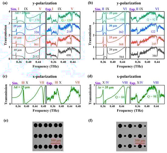 Moreover, the TM GMRs were also measured in all samples when illuminated by the x-polarized THz wave. Two transmissions of the metasurfaces with Δd = 25 μm and Δr = 35 μm, respectively, are shown in Figure 4c,d. We can see that the resonance X is well measured and agrees with the calculations for the metasurface with Δd = 25 μm. However, the resonances III and VII that were considered are not clearly observed in the measurements. Whereas for the metasurface with Δr = 35 μm, the resonance IV is not observed. A strong resonance VIII is measured with a Q-factor of 98, which agrees well with the simulation. However, it seems to be more difficult to observe QBICs of our metasurfaces under x-polarized light illumination as compared to the case of y-polarized incident light. This can be attributed to the diffraction efficiency of metagrating with a finite number of periods for different polarization incidences. The decrease in Λy will greatly improve the observation of TM GMRs for a certain sample size [,].