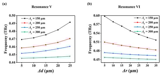 Finally, a comparison of the influence of Δd or Δr on the resonance frequency for different lattice constants Λy when Λx = 150 μm is shown in Figure 5. It is easy to see that as Λy increases from 150 μm to 300 μm, the influence of Δd or Δr on the resonance frequencies becomes weaker and weaker. For example, as Δd varies from 5 μm to 25 μm, the frequency of resonance V of the metasurface with Λy = 300 μm only changes by 2.6 GHz, while it changes by 22.2 GHz for the metasurface with Λy = 150 μm. Similarly, as Δr varies from 5 μm to 35 μm, the frequency of resonance VI of the metasurface with Λy = 300 μm only changes by 6.8 GHz, while it changes by 81.5 GHz for the metasurface with Λy = 150 μm. This effect can be explained as follows: when Λy increases, the influence of Δd or Δr on the equivalent refractive index of the slab waveguide becomes weaker and weaker. The working frequency is less sensitive to the regulation parameters Δd or Δr, which is important for the design and application of such high-Q metasurfaces.