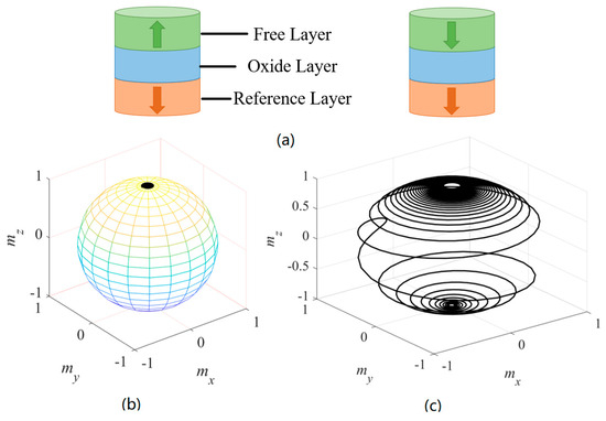 The typical sandwich structure of the STT-MTJ device is shown in Figure 1a, including the free layer, oxide layer, and reference layer, respectively [3]. The magnetization direction of the reference layer is fixed at (0, 0, 1), and the magnetization of the free layer can store information. As shown in Figure 1, with = 5°, when ISTT = 5 μA, the STT moment is not large enough and remains at (0, 0, 1) due to the damping term. At this time, the MTJ device is in the P state. When ISTT = 200 μA, the MTJ device is switched to the AP state. At this time, is changed to be (0, 0, −1).