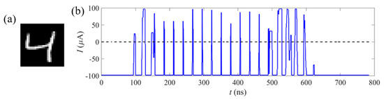 Next, the behavior of the MTJ synapses was investigated with the implementation of the handwritten digit images in the MNIST database [24,25]. Figure 3 shows one of the images used in the paper. As shown in Figure 3a, the image of the handwritten digit “4” is a 28 × 28 matrix, with 784 pixels in total. In the SNN field, the image is transformed into a current pulse sequence, which is named a presynaptic pulse sequence. During the changing process, the basic principle is that the pixel in the pure black area is noted as ‘0′, while the pixel in the pure white area is noted as ‘1′. As show in Figure 3b, these pixels are converted to a series of current pulses, where the pixels close to ‘0′ are converted into a negative current pulse and the pixels close to ‘1′ are converted into a positive current pulse.