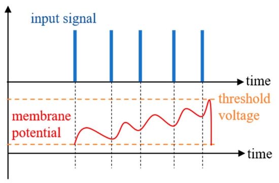 The similar properties of the STT-MTJ device and the biological neuron are studied in this section. Figure 5 shows a schematic diagram of the membrane potential of a biological neuron, in which the spike and the leakage of the input are integrated together. The neuron would be activated when the membrane potential exceeds the threshold voltage [7].