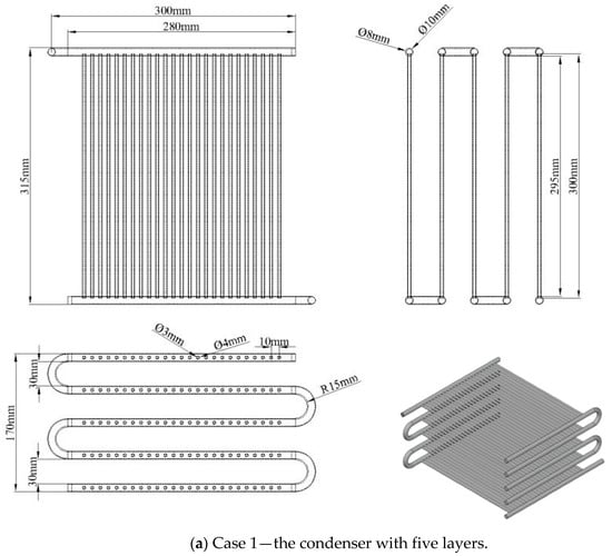 Based on the same overall heat transfer coefficient, this study offers two design configurations for the condenser, consisting of Case 1 (five layers of copper tubes) and Case 2 (eight layers of copper tubes), with dimensions and parameters shown in Figure 2 and Table 2. These condensers use mini-size tubes. For Case 2, there are two tube sets (banks) arranged in parallel; each set has four tube layers (or four passes). Each layer has 25 mini tubes with the outer and inner diameters of 4 mm and 3 mm, respectively. The actual image of the condenser with eight layers using mini tubes is shown in Figure 3. The condensing mini tubes are flooded in the cooling water tank.
