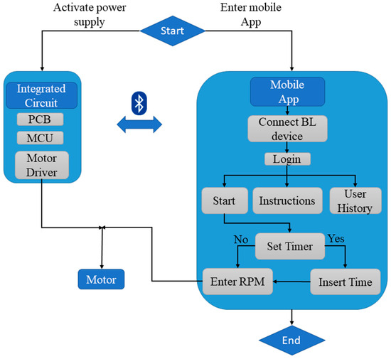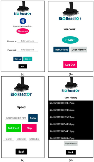 When starting the application, the main screen is viewed (Figure 8a). The main screen includes the Bluetooth icon button, which is used to establish a Bluetooth connection between the bioreactor device and the application. Initially, users have to sign up in order to use the features of the application, so that unauthorized access to the motor control system is prevented. The login credentials are stored in the Firebase Realtime Database (https://firebase.google.com/ (accessed on 20 September 2023)).