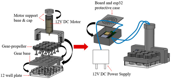 The prototype can be divided into two parts: the first part consists of the commercial well plate, the gear base, the gear-propellers and the motor support base and cap with the motor inside it, and the second part consists of the board and ESP32 protective case with the PCB inside it. These two parts are connected with two 1.5 m cables that connect the motor with the PCB. Since the parts are not screwed together with bolts, the device can be easily disassembled at any time, if any of the components needs replacing. The prototype has been designed to be dimensionally compatible with a CO2 incubator, facilitating its seamless integration into the laboratory setting. The cables of the power source pass through an opening of the CO2 incubator.