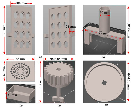 To adjust the 3D printing parameters and generate the G-code, Prusa Slicer 2.5.0 was utilized. The printing parameters were configured as follows: the nozzle temperature was set to 260 °C, the bed temperature was set to 100 °C, the layer height was set to 0.25 mm to determine the print quality, and the infill of the parts was set to 20%. Additionally, a nozzle with a diameter of 0.4 mm was employed for all the printed parts. In terms of the printing material, a 1.75 mm-diameter acrylonitrile butadiene styrene (ABS) filament was utilized during the fused deposition modelling (FDM) process. ABS is compatible with EtO (ethylene oxide) sterilization, but is not compatible with autoclave or gamma sterilization. However, due to its temperature resistance [28], sufficient mechanical properties, toughness and durability [29], ABS exhibits favorable behavior in sterilization methods involving washes in 10% bleach, 70% ethanol, distilled water rinses, and short periods of time in UV irradiation [13,30]. Figure 3 presents the standard triangle language (STL) files of the bioreactor’s components.