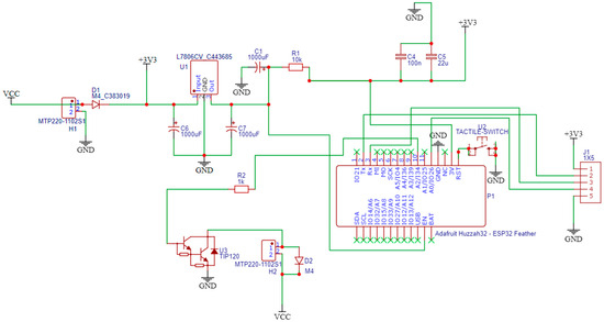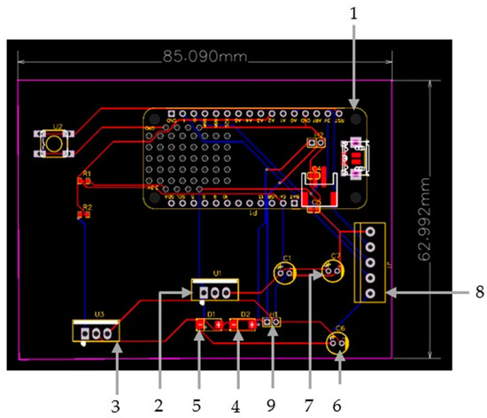 The electronic hardware design was implemented using the EasyEDA STD (V.6.5.34, 2023) free open-source software. The schematic design of the hardware components is created via EasyEDA, as presented in Figure 4. The PCB layout is exported automatically from EasyEDA, which is shown in Figure 5, with the assembled electronic components being numbered as explained later.