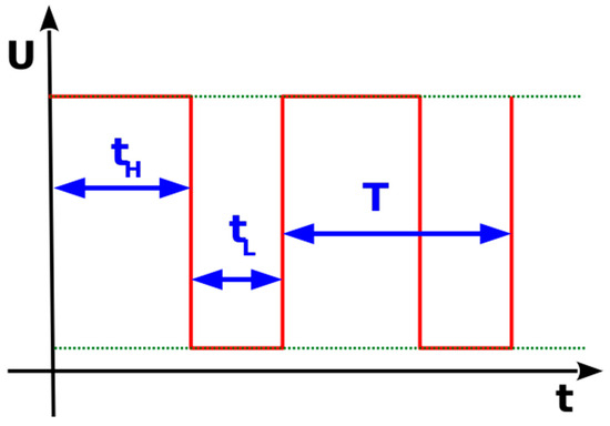 The firmware related to the control of the 3D printed bioreactor subunits and the interfacing between them was developed and tested with appropriate kits, and it was transferred to the developed hardware. The motor speed is controlled by the generation of a pulse-width modulation (PWM) signal to the base of the NPN transistor. Pulse-width signals are square pulses with controlled ON and OFF states. A PWM signal generated to control analog averages usually has a set frequency (the period is equal to the turn-on time plus the turn-off time) and a variable duty cycle which is produced by regulating the ON (tH) and OFF (tL) states of the pulse, as is shown in Figure 6. PWM, along with a low-pass filter, is a common method of generating an average analog DC voltage equal to: