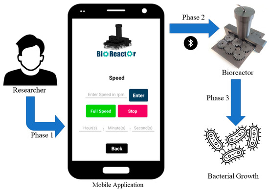 The important role and the utilization of the mobile application in the bacterial growth process using the bioreactor are explained in three phases, which are depicted in Figure 7. These three phases demonstrate how the potential user has complete control over the entire process of bacterial growth, through the bioreactor.