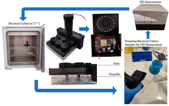 This study aims to bridge this gap by developing a robust do-it-yourself (DIY) bioreactor that utilizes the advantages of additive manufacturing and IoT technology, such as wireless control of the proposed device, real-time data collection, and automating the use of the device in order to save users’ time. The proposed novel device is 3D printed and is based on IoT technologies in order to be wirelessly controlled via Bluetooth protocol. Additionally, an integrated circuit consisting of a microcontroller unit (MCU) is developed using printed circuit board (PCB) design techniques to meet the required electronic hardware specifications. A user-friendly mobile application for Android smartphones was created for better user experience at the experimental stage, and was developed to provide control over the 3D printed IoT bioreactor. The present study utilizes E. coli bacteria, conducted with successful proof of concept, and provides results indicating that the bacterial cell culture proliferated, in accordance with the findings of corresponding publications [20,24]. As similar DIY bioreactors have been employed for the cultivation of human cells in suspension, the proposed bioreactor aims to be leveraged with a specific focus on pluripotent stem cells (hPSCs). The architectural diagram of the smart 3D printed IoT-based bioreactor (Figure 1) illustrates its novel features, including the development of a fully functional prototype using 3D printing techniques, which minimized development time and enabled an easily assembled design. The bioreactor was successfully implemented for bacterial growth experiments. Furthermore, potential future applications in the generation of human organoids and the cultivation of diverse biological cultures are envisioned. The design and simplified assembly process of the proposed bioreactor make it suitable for a wide range of biological and biomedical research applications.