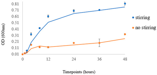 An increase in the bacterial population was observed in both stirring and non-stirring conditions. Bacterial cells were in lag phase during the first hours of culture but grew exponentially after 4 h of incubation. The rate of growth in the stirring condition was significantly greater than that of the respective control (non-stirring), especially after 12 h of culture. Stirring strongly induced bacterial growth in a statistically significant manner up to 48 h of culture (p-value < 0.001). The growth curve observed in our experiment, when compared with growth curves of E. coli reported in the literature [27,28], confirms that the specific bioreactor can serve as a reliable method for bacterial growth in various laboratory settings and applications. These results indicate the value of the bioreactor for culturing cells under stirring conditions, as it emulates the role of a shaking operator that is already used for bacterial cultures. Shaking of the culture helps to control the temperature and aeration of the bacterial growth that affect growth patterns. By agitating the liquid medium, areas of high- or low-nutrient concentration are mixed, and thus shaking causes a decreased lag phase and higher final yield in E. coli [33]. This bioreactor creates optimal conditions for the cultivation and proliferation of bacteria and can find applications across diverse fields, including biotechnology and pharmaceuticals. It can also help to maximize bacterial growth, ultimately leading to enhanced productivity in terms of product generation or furthering scientific investigations and research.