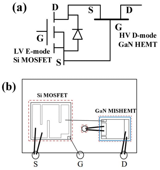 For decades of development, silicon-based MOSFET devices have reached their ability limits [1]. With the rapidly increased demands of power electronics, novel materials, such as GaN and SiC, are nowadays becoming more and more popular due to their capabilities of high power, temperature, frequency, and radiation tolerance [2,3,4]. GaN devices are widely considered to be excellent candidates for microwave use [5,6,7,8,9,10,11,12,13,14]. Recently, GaN materials have also become promising candidates for power use due to their advantages of high voltage and rapid switching time [15]. Nowadays, enhancement-mode (E-mode), or the normally-off p-GaN gate HEMTs, have become the most commercial type as its threshold voltage is above 0 V, where the safety of the circuit is guaranteed. However, low-gate breakdown voltage [16], low-threshold voltage [17], and current-collapse effect [18] are still restricting the direct replacement of MOSFET. Especially, the gate-to-source breakdown voltage of p-GaN gate HEMTs is normally 6 V, while the conventional output of the driver chip in the power system is usually 0~10 V. At present, Cascode devices can be the temporary substitution for its ability of high-gate breakdown voltage and high-threshold voltage, despite the fact that the switching time is slower due to the existence of Si MOSFET.