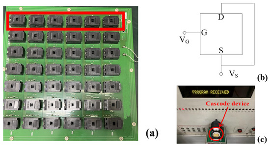 TID experiment board. Each six devices is connected parallelly as a group (a). Irradiation configurations of individual devices (b). BR3500 semiconductor discrete device tester to test the device’s parameters (c).