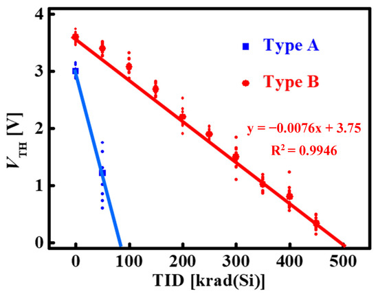 The threshold voltages of Type A and Type B devices at different total doses. The small dots are the tested values, while the large dots are the calculated average values. The red line is the linear fitting for Type B, and the blue line is the linear fitting for Type A. The calculated slope is −0.0076 mV/krad(Si). The goodness of fits (R2) is 0.9946, which is higher than 0.99, showing good linear fitting.