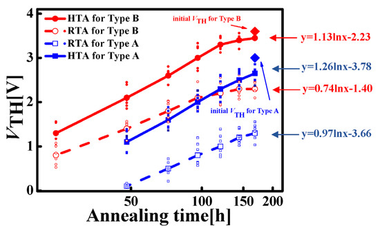 Recovery of VTH of both types. The red solid dots are the tested values of HTA for Type B. The red hollow dots are the tested values of RTA for Type B. The blue solid dots are the tested values of HTA for Type A. The blue hollow dots are the tested values of RTA for Type A. The solid and dashed lines are the calculated average values. The formulas on the right side are the fitted recovery trends.