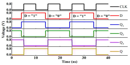 Table 5 shows the various results of D flip-flops with different structures. Compared with conventional D flip-flops, the proposed structure D flip-flop has increased propagation delay, but the SEU hardening ability has been enhanced. In addition, referring to experimental data [15] from the 65 nm FDSOI DICE DFF, the soft error rate of the DICE circuit is significantly lower compared to the conventional DFF and TMR circuits. Experimental data [16,17] from the 22 nm FDSOI DICE indicate that the SEU cross-section of DICE is an order of magnitude lower than that of the traditional DFF in static state. The asymmetrically fortified DFF exhibits a similar performance to DICE in SEU simulations, indirectly demonstrating the reliability of this circuit.