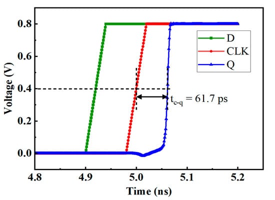 The propagation delay of the D flip-flop is defined as the time difference between the moment when the clock signal voltage rises to 50% VDD and the moment when the Q node voltage rises to 50% VDD. As shown in Figure 3, the propagation delay of a conventional D flip-flop is 61.7 ps.