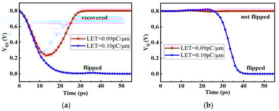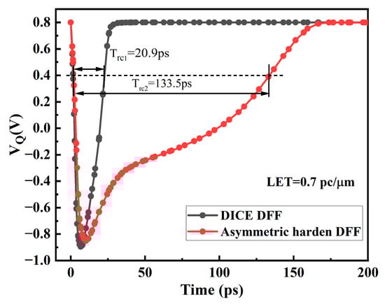 The DICE structure D flip-flop is similar to the SRAM of this structure, and each node can resist SEU. As shown in Figure 12, under various energy pulse current injections, the voltage of the Q node can eventually return to the original value. The DICE structure D flip-flop has a smaller propagation delay and better SEU hardening ability, but it will bring a larger area overhead. Figure 13 illustrates the voltage variations at the Q nodes of the two circuits under SET current with LET = 0.7 pc/μm (particle energy loss) conditions. It can be observed that both the asymmetrically fortified DFF and DICE DFF can maintain circuit logic integrity under high-energy particle impacts. In this figure, we define the recovery time (Trc) as the time difference between the voltage dropping to 50% VDD and recovering to 50% VDD. According to the results, it is found that DICE exhibits a significantly shorter recovery time than the asymmetrically fortified circuit, only requiring approximately 20.9 ps, while the asymmetrically fortified circuit needs 133.5 ps. Nevertheless, both circuits demonstrate strong capabilities in recovering from soft errors.