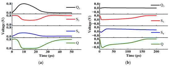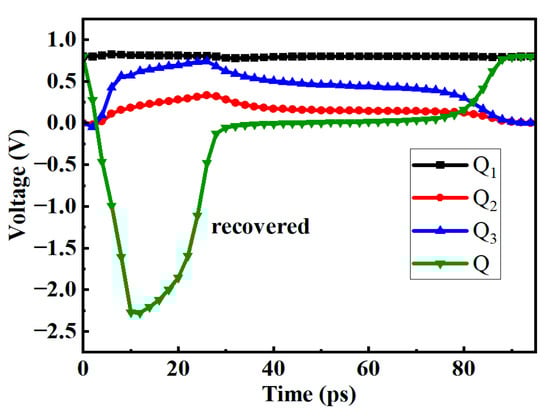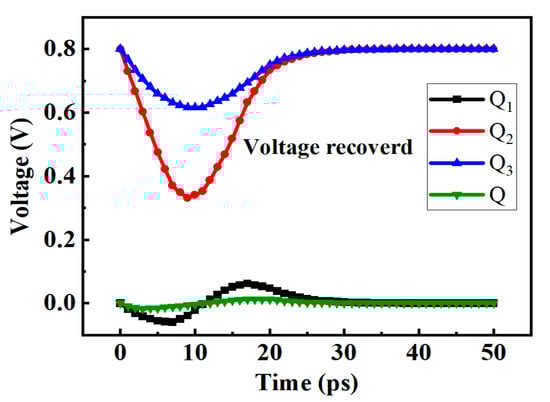 Different from the Q1 node, when the clock is high, if a high-energy pulse current with an LET value of 0.7 pC/μm is injected into the Q2 node, the result is shown in Figure 5, and the voltage of the Q2 has not yet been reversed. The reason is that the transmission gate T2 is on, the pulse current of the Q2 node has been reduced when it is transmitted to the Q3 node through the transmission gate, and the change in the voltage of the Q3 node is not enough to cause the slave latch to flip, so the voltage of the Q2 node will gradually recover when the pulse current disappears.