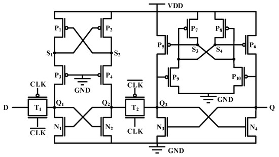 To prevent a large number of errors, it can be considered to harden the basic unit of the flip-flop. The common hardening schemes can be divided into two categories: adding redundant units and introducing negative feedback mechanisms [10,11]. The DICE structure is proposed based on these two hardening methods [12], which has strong resistance against SEU. However, it also incurs a significant area overhead in the circuit. Furthermore, most of the traditional hardening schemes use the symmetrical structure of master–slave latches; this paper studies the basic structure of conventional D flip-flop and finds that the SEU hardening capability of the master latch in the flip-flop of this structure is stronger than that of the slave latch. On this basis, this paper introduces a novel structure of D flip-flop with the following characteristics: