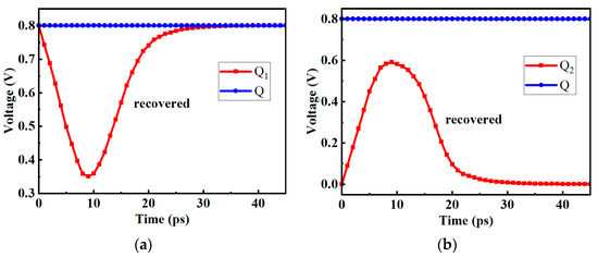 When the clock is low, pulse currents are injected into the Q1 and Q2 nodes, respectively, and the results are shown in Figure 8. The voltages of the Q1 and Q2 will recover quickly, because the transmission gate T1 is turned on. At the same time, the voltage change in the master latch will not affect the Q node because the transmission gate T2 is turned off, so the output of flip-flop will not be affected.