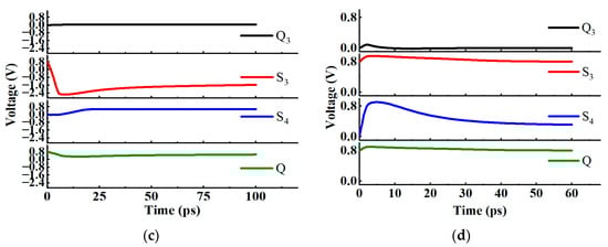 The voltage diagram of the new structure D flip-flop when injected with an SET current of LET = 0.7 pc/μm at (a) Q3 (b) Q (c) S3 (d) S4.