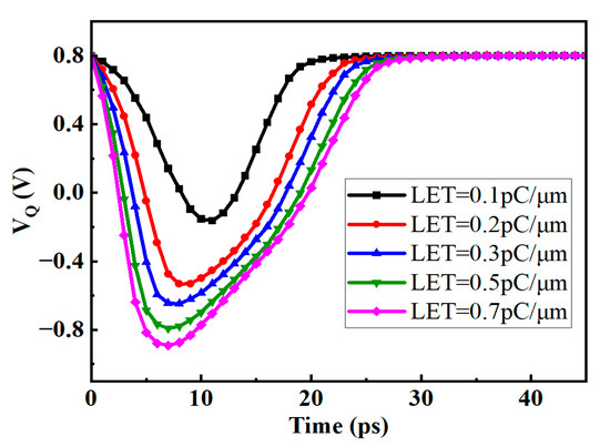 From the above results, it can be concluded that when the master latch of the D flip-flop is affected by SEU, if the clock signal is low, it will not affect the output of the D flip-flop, and if the clock is high, only Q1 is a sensitive node. For the slave latch, when the clock is low, the transmission gate T2 is turned off, and the voltage of the internal node will not be affected by the master latch. However, when the pulse current is directly injected into the slave latch, the voltage will be flipped. The LET flipping threshold of the Q3 node is between 0.07 and 0.08 pC/μm, and that of the Q node is between 0.06 and 0.07 pC/μm.