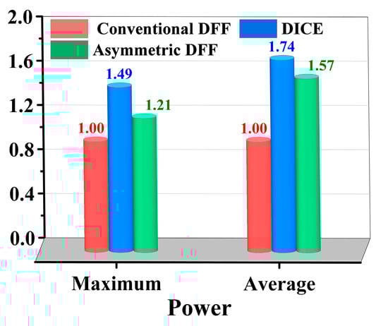 The power consumption of the two circuits is also compared. The average power and peak power of these three circuits within the first 40 ps under the same operating conditions were calculated using Hspice software. Under the same operating conditions, the power consumption of the conventional DFF is defined as 1. Figure 14 shows the power consumption comparison of the three circuits. Due to the advantages of the asymmetrically fortified structure, the circuit has six fewer transistors compared to DICE, resulting in lower average and peak power consumption. Under the same operating conditions, the average power and peak power of the asymmetrically fortified DFF are 1.57 and 1.21, respectively, while those of DICE are 1.74 and 1.49. Therefore, it can be concluded that the asymmetrically fortified circuit has a significant advantage in power control. The complete comparative results are listed in Table 5.