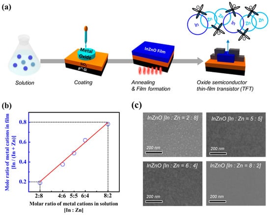 (a) Fabrication scheme of solution-processed InZnO semiconductor TFTs; (b) molar ratio of metal cations presented in the InZnO film and InZnO solution; (c) surface image (top-view) of cation-composition controlled InZnO films.