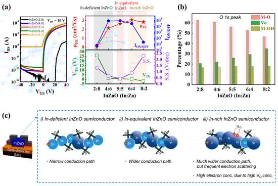 (a) Electrical performance of TFTs fabricated using cation-composition controlled InZnO films, including the IDS–VGS transfer curve and figures-of-merit (μFE, ION/OFF, VTh, and S.S.); (b) chemical bonding states of oxygen elements present in cation-composition controlled InZnO semiconductor films, i.e., M-O bonds, oxygen vacancies (VO), and O-H bonds; (c) electrical conduction path and free electron transport behavior in cation-composition controlled InZnO films.