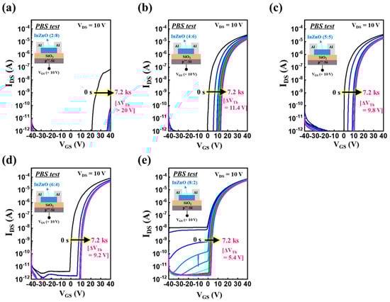 (a–e) Transfer-curve shifts of oxide TFTs fabricated using cation-composition controlled InZnO semiconductors under PBS tests; the composition ratios of In to Zn (In:Zn) were (a) 2:8, (b) 4:6, (c) 5:5, (d) 6:4, and (e) 8:2.