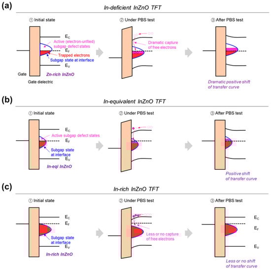 However, as shown in Figure 4, not all the subgap energy states present in the InZnO films can function as charge-trapping states. Only the subgap states that are not filled with electrons can function as active charge-trapping states, causing a significant positive shift in the transfer curve from the PBS test. As shown in Figure 4a, most of the subgap states present in the In-deficient InZnO films exist as electron-unfilled active charge trap states owing to the island-like crystalline film state. Therefore, InZnO TFT with In-deficient InZnO (In:Zn = 2:8) can exhibit severe electrical instability. In contrast, as shown in Figure 4b,c, when the In content increase, the number of electron-unfilled active subgap states decrease, owing to an increase in the free electron density. Additionally, the In-rich InZnO film contains many subgap states owing to the excessive VO concentration; however, they exist as electron-filled inactive charge trap states owing to their high free electron density. Thus, the electrical stability of InZnO TFTs can be improved by introducing In-equivalent and In-rich InZnO semiconductors. Compared with In-deficient InZnO, In-equivalent (In:Zn = 5:5) and In-rich (In:Zn = 6:4 and 8:2) InZnO films are more appropriate for realizing oxide TFTs with good electrical stability. The hysteresis curves confirmed that the density of the active charge-trapping states in the InZnO film was suppressed when the In content increased (Figure S3) []. The densities of active subgap defect states in the InZnO films with In:Zn composition ratios of 2:8, 4:6, 5:5, 6:4, and 8:2 were 1.15 × 1012, 9.93 × 1011, 9.06 × 1011, 7.88 × 1011, and 3.88 × 1011 cm−2, respectively.