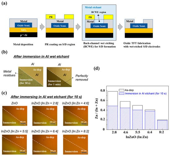 (a) Typical sequence of forming S/D metal electrodes of oxide TFTs through the BCWE process; (b) OM images taken after immersing Al layers with a film thickness of 100 nm in an Al wet etchant; (c) OM images and (d) changes in the composition of composition-controlled InZnO films before and after immersion in the Al wet etchant for 10 s.