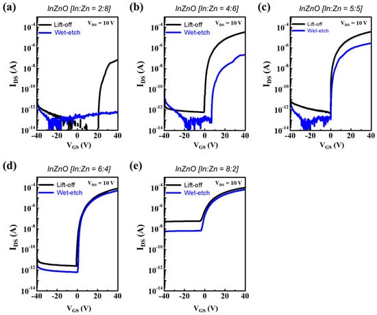 (a–e) Transfer curves of composition-controlled InZnO TFTs with Al S/D electrodes defined by wet-etching (using an acidic H2PO4-based Al etchant (pH ≈ 4)) and conventional lift-off processes; the composition ratios of In to Zn (In:Zn) were (a) 2:8, (b) 4:6, (c) 5:5, (d) 6:4, and (e) 8:2.