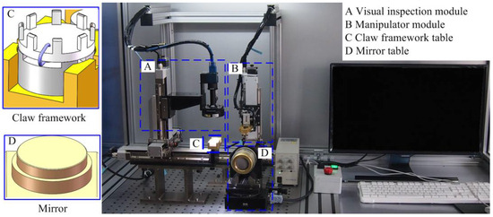 The assembly system is depicted in Figure 2. It comprises a visual inspection module, a manipulator module, a claw framework table, and a mirror table. The visual inspection module consists of a visual component and an X-Y-Z precision stage. It includes a camera, a telecentric lens, a coaxial light source, and a ring light source, which is aimed at inspecting the claw framework and assisting with the alignment of the assembly. It used a camera with a resolution ratio of 3088 × 2064 and a pixel size of 2.46 μm × 2.46 μm, as well as a telecentric lens with a magnification of 1 to obtain high-resolution images of the parts. The manipulator module is used to pick up the claw framework and realize the assembly with the mirror. Tables for the claw framework and mirror were used to position the parts accurately.