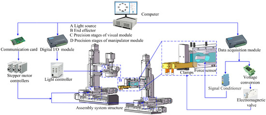 The hardware relationships of the assembly system can be established based on its structure, as shown in Figure 3. The 3-DOF precision stages of the visual module and manipulator module are connected to an Industrial Personal Computer (IPC) via motion controllers and a communication card to realize displacement in the X, Y, and Z directions. The light controller communicates with the IPC using a digital I/O module to control the brightness of coaxial and ring light sources. A force sensor and clamp are installed on the end effector of the manipulator module. The force sensor is connected to the IPC via a signal conditioning module and a data acquisition module to achieve accurate control of the end effector in the Z direction. The clamp is mounted on the cylinder, which is connected to the electromagnetic valve and voltage conversion module, enabling the operation of clamping and releasing of the claw framework. Utilizing this experimental system it ensures the precise assembly of the parts and compliance with the relevant assembly requirements.