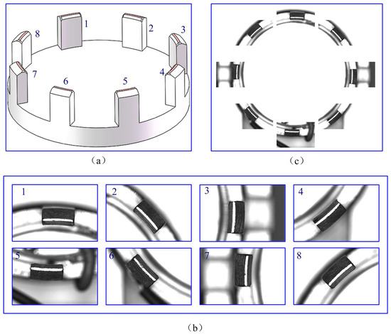 For the experiment of the claw framework, the images were captured under identical lighting conditions. As depicted in Figure 4, it shows an experimental image of a claw framework. For convenience in description, the arcs of the eight-section are numbered 1–8 in a clockwise manner, as shown in Figure 4a. The partial images and the entire image are shown in Figure 4b,c, respectively.