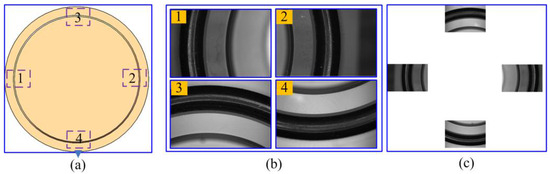Figure 5 shows an experimental image of a mirror, which is obtained using the image mosaic technique, similar to the claw framework. The image acquisition position is depicted in Figure 5a. Because a unique circle can be determined using two points passing through the center, at least two arc segments passing through the center of the circle are required to determine the size of the part. Meanwhile, the more the image information, the more accurate the measurement result. When measuring the mirror, it is easy to obtain images 1, 2, 3, or 4 in Figure 5a, only moving the X- or Y-axis of the visual system. To use more image information and reduce the workload of image acquisition, the information of these four groups of arc segments was used to calculate its size. The partial images and the entire image are shown in Figure 5b,c, respectively (In practice, a black rubber ring is installed on the outer ring of the mirror to change the contrast of the image, making it easier to extract edges).