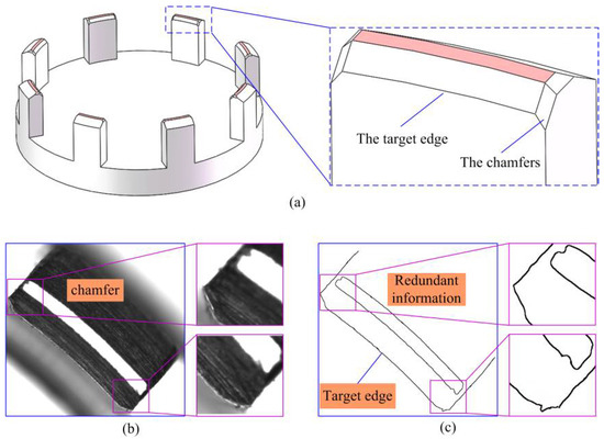 The target edge with the redundant chamfers information: (a) The chamfers of arc structure; (b) The chamfers image; (c) Redundant information between the target edge.