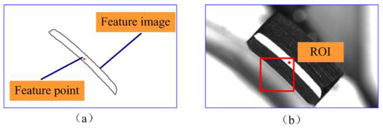 Based on the characteristics of the image, a closed contour can be considered a feature image, and its centroid can be obtained after processing, as shown in Figure 7a. The centroid serves as the feature point of the feature image. Next, the ROI of the image can be described as a rectangular area, as depicted in Figure 7b, based on the feature point of the feature image and the design dimensions of the part. Therefore, it is only to extract the feature point of the feature image, and the ROI of the image can be obtained using the feature point.