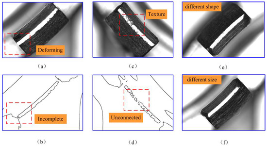 Moreover, the size and shape of the feature images are also inconsistent, as depicted in Figure 8e,f. Therefore, the feature images of this part exhibit rotational changes, inconsistencies in size and shape, the presence of noise, and a lack of clear boundaries in some cases. Consequently, it is challenging to extract all features accurately from the image.